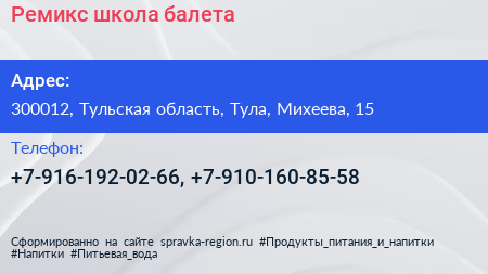 Ремикс, школа балета по адресу 300012, Тульская область, Тула, Михеева, 15 в дальнейшем Организация, размещена в следующих категориях: