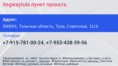 Segwaytula, пункт проката по адресу 300041, Тульская область, Тула, Советская, 11/6 в дальнейшем Организация, размещена в следующих категориях: