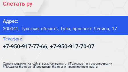 Слетать.ру по адресу 300041, Тульская область, Тула, проспект Ленина, 17 в дальнейшем Организация, размещена в следующих категориях: