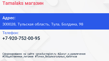 Tamalaks, магазин по адресу 300028, Тульская область, Тула, Болдина, 98 в дальнейшем Организация, размещена в следующих категориях: