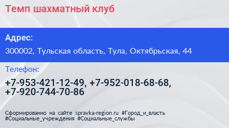 Темп, шахматный клуб по адресу 300002, Тульская область, Тула, Октябрьская, 44 в дальнейшем Организация, размещена в следующих категориях: