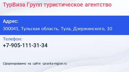 ТурВиза Групп, туристическое агентство по адресу 300041, Тульская область, Тула, Дзержинского, 10 в дальнейшем Организация, размещена в следующих категориях: