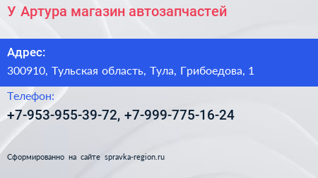 У Артура, магазин автозапчастей по адресу 300910, Тульская область, Тула, Грибоедова, 1 в дальнейшем Организация, размещена в следующих категориях: