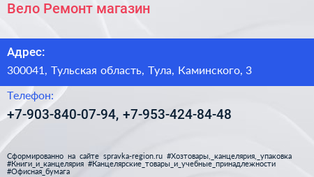 Вело Ремонт, магазин по адресу 300041, Тульская область, Тула, Каминского, 3 в дальнейшем Организация, размещена в следующих категориях: