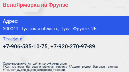 ВелоЯрмарка на Фрунзе по адресу 300041, Тульская область, Тула, Фрунзе, 2Б в дальнейшем Организация, размещена в следующих категориях:
