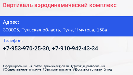 Вертикаль, аэродинамический комплекс по адресу 300005, Тульская область, Тула, Чмутова, 158а в дальнейшем Организация, размещена в следующих категориях:
