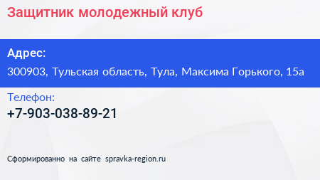 Защитник, молодежный клуб по адресу 300903, Тульская область, Тула, Максима Горького, 15а в дальнейшем Организация, размещена в следующих категориях: