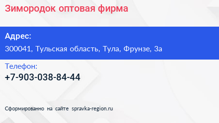 Зимородок, оптовая фирма по адресу 300041, Тульская область, Тула, Фрунзе, 3а в дальнейшем Организация, размещена в следующих категориях:
