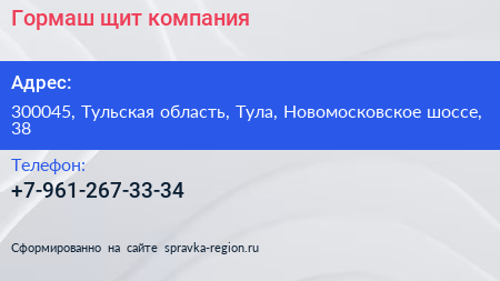 Гормаш-щит, компания по адресу 300045, Тульская область, Тула, Новомосковское шоссе, 38 в дальнейшем Организация, размещена в следующих категориях: