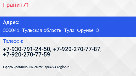 Гранит71 по адресу 300041, Тульская область, Тула, Фрунзе, 3 в дальнейшем Организация, размещена в следующих категориях:
