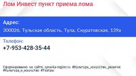 Лом Инвест, пункт приема лома по адресу 300026, Тульская область, Тула, Скуратовская, 139а в дальнейшем Организация, размещена в следующих категориях:
