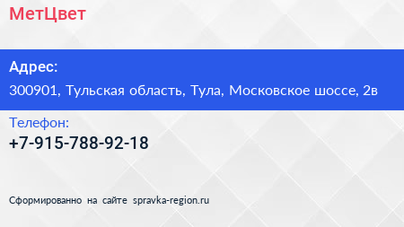 МетЦвет по адресу 300901, Тульская область, Тула, Московское шоссе, 2в в дальнейшем Организация, размещена в следующих категориях:
