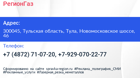 РегионГаз по адресу 300045, Тульская область, Тула, Новомосковское шоссе, 46 в дальнейшем Организация, размещена в следующих категориях: