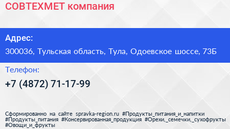 СОВТЕХМЕТ, компания по адресу 300036, Тульская область, Тула, Одоевское шоссе, 73Б в дальнейшем Организация, размещена в следующих категориях: