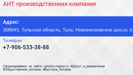 АНТ, производственная компания по адресу 300045, Тульская область, Тула, Новомосковское шоссе, 6 в дальнейшем Организация, размещена в следующих категориях: