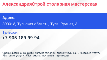 АлександрияСтрой, столярная мастерская по адресу 300016, Тульская область, Тула, Рудная, 3 в дальнейшем Организация, размещена в следующих категориях: