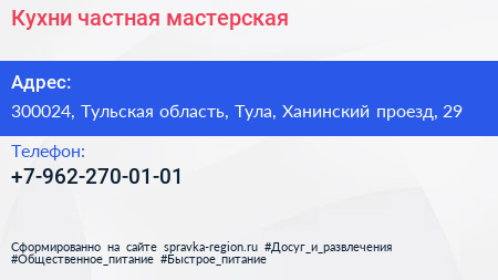Кухни, частная мастерская по адресу 300024, Тульская область, Тула, Ханинский проезд, 29 в дальнейшем Организация, размещена в следующих категориях: