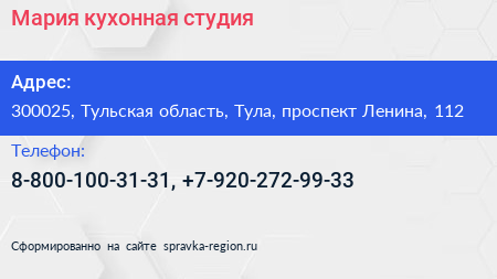 Мария, кухонная студия по адресу 300025, Тульская область, Тула, проспект Ленина, 112 в дальнейшем Организация, размещена в следующих категориях: