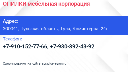 ОПИЛКИ, мебельная корпорация по адресу 300041, Тульская область, Тула, Коминтерна, 24г в дальнейшем Организация, размещена в следующих категориях: