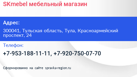 SKmebel, мебельный магазин по адресу 300041, Тульская область, Тула, Красноармейский проспект, 24 в дальнейшем Организация, размещена в следующих категориях: