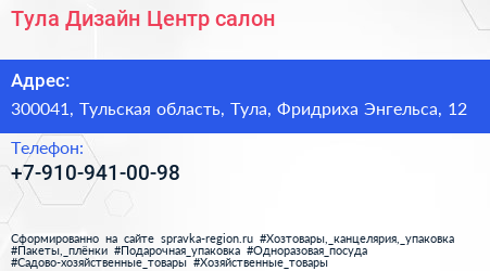 Тула Дизайн Центр, салон по адресу 300041, Тульская область, Тула, Фридриха Энгельса, 12 в дальнейшем Организация, размещена в следующих категориях: