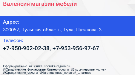 Валенсия, магазин мебели по адресу 300057, Тульская область, Тула, Пузакова, 3 в дальнейшем Организация, размещена в следующих категориях: