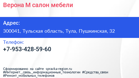 Верона-М, салон мебели по адресу 300041, Тульская область, Тула, Пушкинская, 32 в дальнейшем Организация, размещена в следующих категориях: