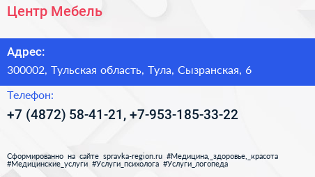 Центр Мебель по адресу 300002, Тульская область, Тула, Сызранская, 6 в дальнейшем Организация, размещена в следующих категориях: