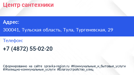 Центр сантехники по адресу 300041, Тульская область, Тула, Тургеневская, 29 в дальнейшем Организация, размещена в следующих категориях: