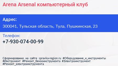 Arena Arsenal, компьютерный клуб по адресу 300041, Тульская область, Тула, Пушкинская, 23 в дальнейшем Организация, размещена в следующих категориях: