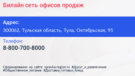 Билайн, сеть офисов продаж по адресу 300062, Тульская область, Тула, Октябрьская, 95 в дальнейшем Организация, размещена в следующих категориях:
