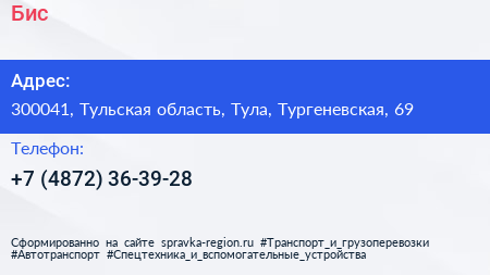 Бис+ по адресу 300041, Тульская область, Тула, Тургеневская, 69 в дальнейшем Организация, размещена в следующих категориях: