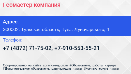 Геомастер, компания по адресу 300002, Тульская область, Тула, Луначарского, 1 в дальнейшем Организация, размещена в следующих категориях: