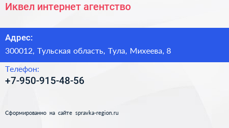 Иквел, интернет-агентство по адресу 300012, Тульская область, Тула, Михеева, 8 в дальнейшем Организация, размещена в следующих категориях: