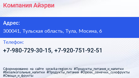 Компания Айэрви по адресу 300041, Тульская область, Тула, Мосина, 6 в дальнейшем Организация, размещена в следующих категориях: