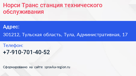 Норси-Транс, станция технического обслуживания по адресу 301212, Тульская область, Тула, Административная, 17 в дальнейшем Организация, размещена в следующих категориях: