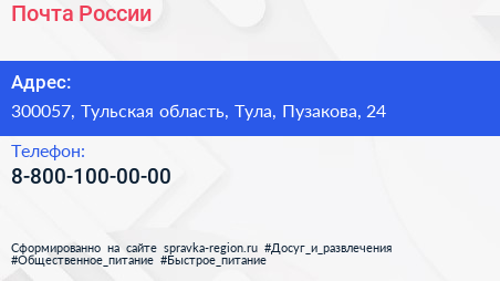 Почта России по адресу 300057, Тульская область, Тула, Пузакова, 24 в дальнейшем Организация, размещена в следующих категориях: