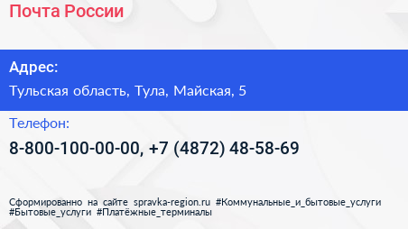 Почта России по адресу Тульская область, Тула, Майская, 5 в дальнейшем Организация, размещена в следующих категориях: