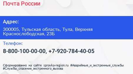 Почта России по адресу 300005, Тульская область, Тула, Верхняя Краснослободская, 23Б в дальнейшем Организация, размещена в следующих категориях: