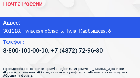 Почта России по адресу 301118, Тульская область, Тула, Карбышева, 6 в дальнейшем Организация, размещена в следующих категориях: