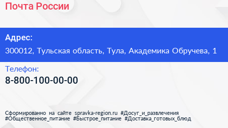 Почта России по адресу 300012, Тульская область, Тула, Академика Обручева, 1 в дальнейшем Организация, размещена в следующих категориях: