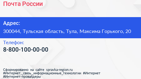 Почта России по адресу 300044, Тульская область, Тула, Максима Горького, 20 в дальнейшем Организация, размещена в следующих категориях: