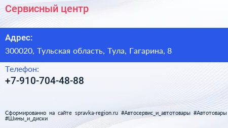 Сервисный центр по адресу 300020, Тульская область, Тула, Гагарина, 8 в дальнейшем Организация, размещена в следующих категориях: