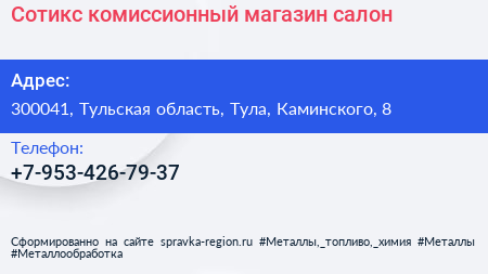 Сотикс, комиссионный магазин-салон по адресу 300041, Тульская область, Тула, Каминского, 8 в дальнейшем Организация, размещена в следующих категориях: