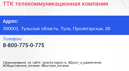 ТТК, телекоммуникационная компания по адресу 300001, Тульская область, Тула, Пролетарская, 28 в дальнейшем Организация, размещена в следующих категориях: