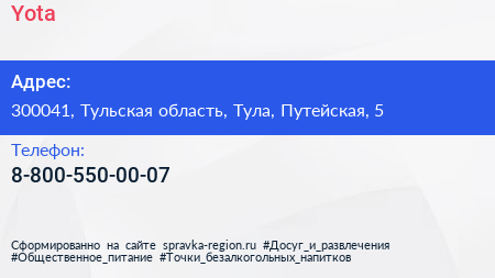Yota по адресу 300041, Тульская область, Тула, Путейская, 5 в дальнейшем Организация, размещена в следующих категориях:
