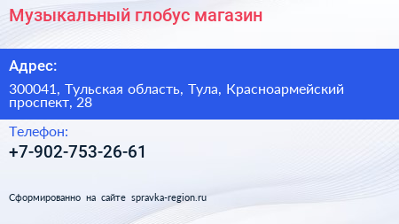 Музыкальный глобус, магазин по адресу 300041, Тульская область, Тула, Красноармейский проспект, 28 в дальнейшем Организация, размещена в следующих категориях: