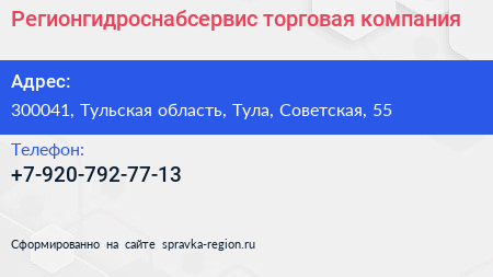 Регионгидроснабсервис, торговая компания по адресу 300041, Тульская область, Тула, Советская, 55 в дальнейшем Организация, размещена в следующих категориях: