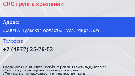 СКС, группа компаний по адресу 300012, Тульская область, Тула, Мира, 50а в дальнейшем Организация, размещена в следующих категориях: