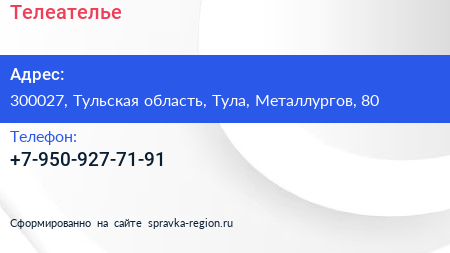 Телеателье по адресу 300027, Тульская область, Тула, Металлургов, 80 в дальнейшем Организация, размещена в следующих категориях: